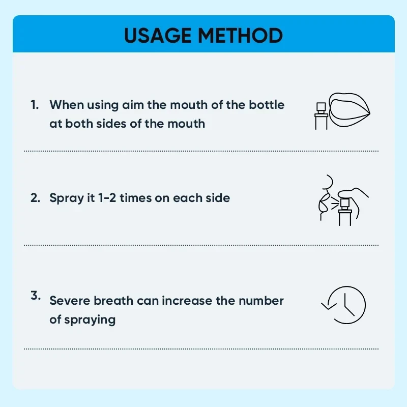Align the nozzle with the mouth, Spray 2-3 sprays on the mouth or throat. (For those with severe breath, increase the number of sprays appropriately).